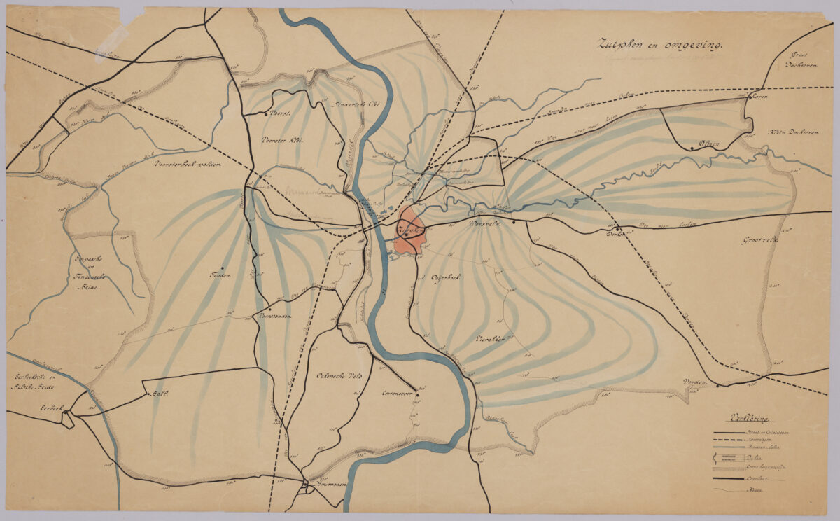 Beeld: de werking van de Baakse Overlaat, waarbij het water naar het noorden stroomde en via de Tolbrug en Doorlaatbrug in Warnsveld kon wegvloeien via de Berkel. 1880, Erfgoedcentrum Zutphen.